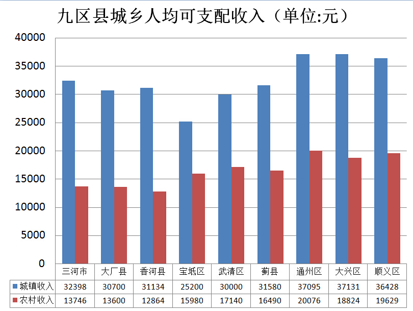 这张图是九区县城乡人均可支配收入,武清的城镇收入数据没查到,是通过工资收入估算的。不难看出北京三区比天津河北各区县的城镇收入高一个层次。农村收入则是河北-天津-北京逐步递增。