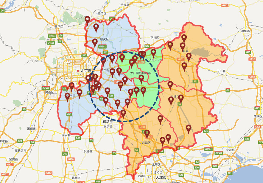 这张图就是京津冀九区县产业园区分布示意图,这个圈的大小和北京六环差不多,半径大约30公里,这个范围内的产业园区数量占到了九区县所有产业园区一半以上。圆圈的范围涵盖了通州区几乎全境,北三县大部分,武清区北部、大兴区东部,还涉及一小部分廊坊市辖区。根据现有产业园区布局的基础,未来京津冀结合部的产城融合工作基本上就处在这个圈内。