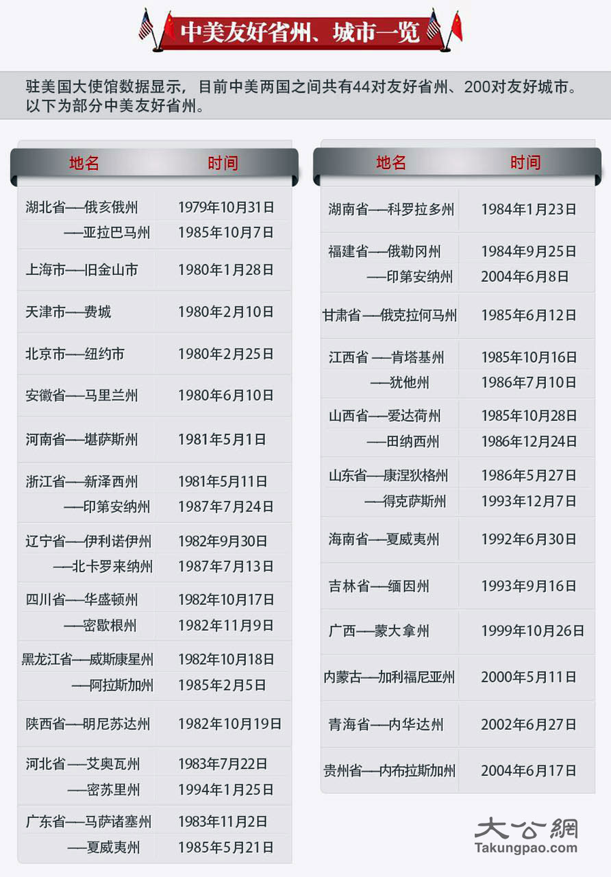 驻美国大使馆数据显示,目前中美两国之间共有44对友好省州、200对友好城市。以上为部分中美友好省州。制图:大公网 王雨