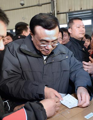 2月5日,李克强来到内蒙古兴安盟万佳食品公司与基层工人们交谈。