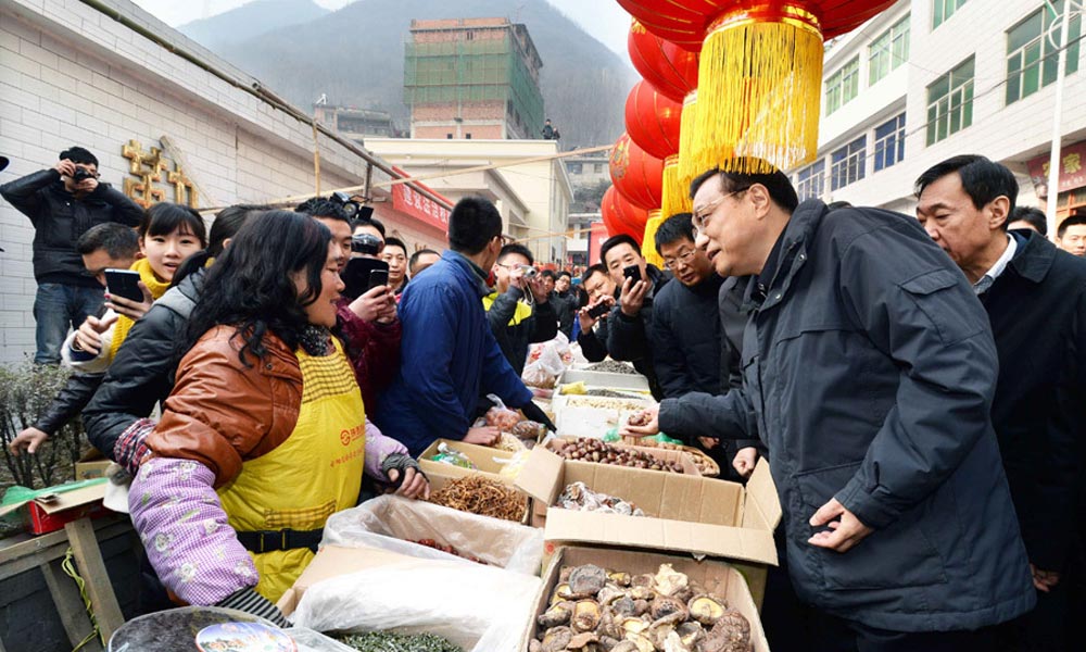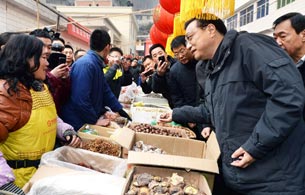 1月27日,李克强在陕西小河镇集市与一位摊主交谈。