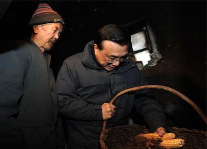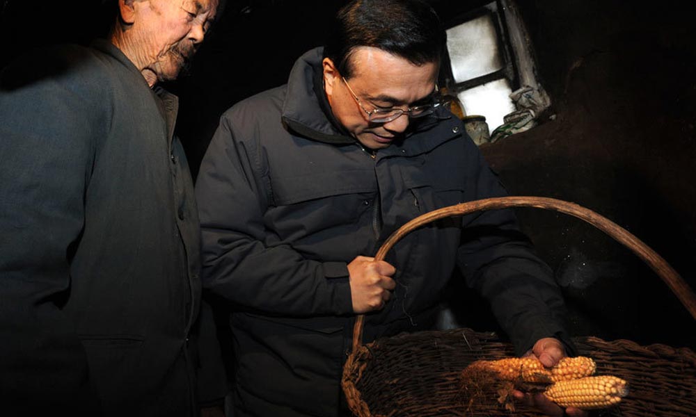 2月4日,李克强来到内蒙古兴安盟查干珠日和嘎查走进76岁的扎那老人家中查看老人家中的粮食储备。