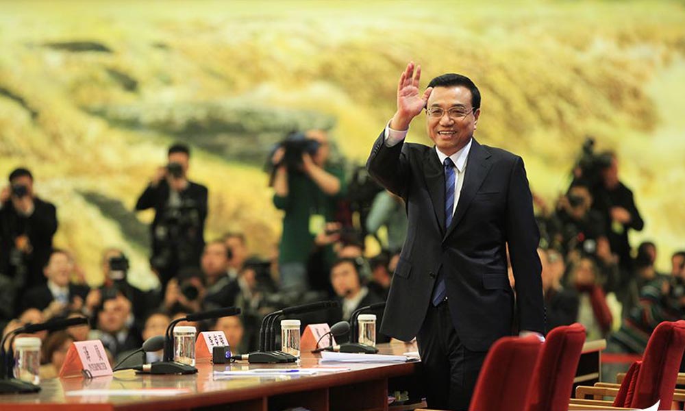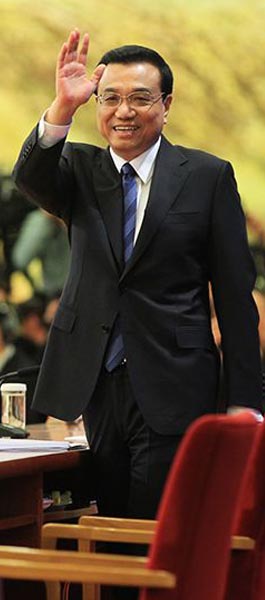 3月13日上午,十二届全国人大二次会议举行闭幕会,大会闭幕后,国务院总理李克强在人民大会堂金色大厅与中外记者见面并回答记者提问。图为李克强步入金色大厅向记者挥手致意。