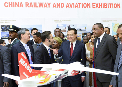 5月5日,李克强总理与埃塞俄比亚总理海尔马里亚姆、非洲联盟委员会主席祖马共同参观在亚的斯亚贝巴非盟会议中心举办的中国铁路航空展。