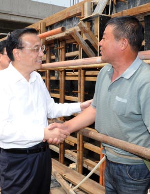 7月24日,李克强总理在德州陵县雨污分流工地与工人交流。