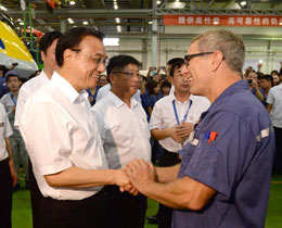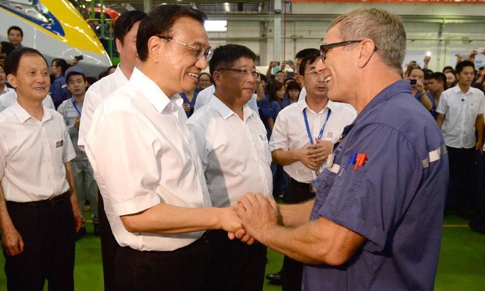 7月4日,李克强总理在南车株洲公司调研时与外国专家交谈。