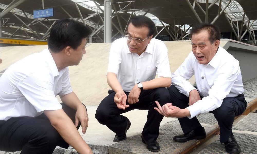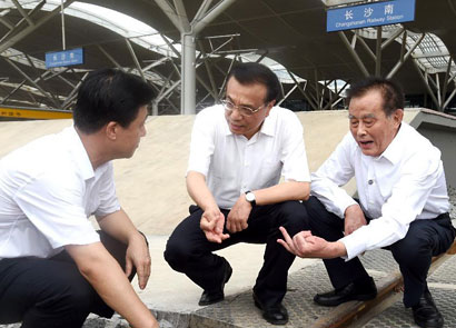 7月3日,李克强总理在沪昆高铁长沙南站施工现场考察。