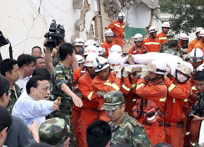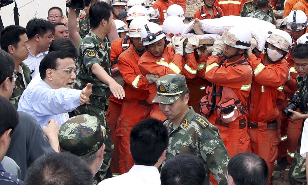 8月4日,李克强总理来到云南鲁甸地震震中龙头山镇考察灾情,在察看废墟上救援情况时,几名战士抬着刚获救伤员走出,李克强主动让道,并抬起手臂护送队伍离开。