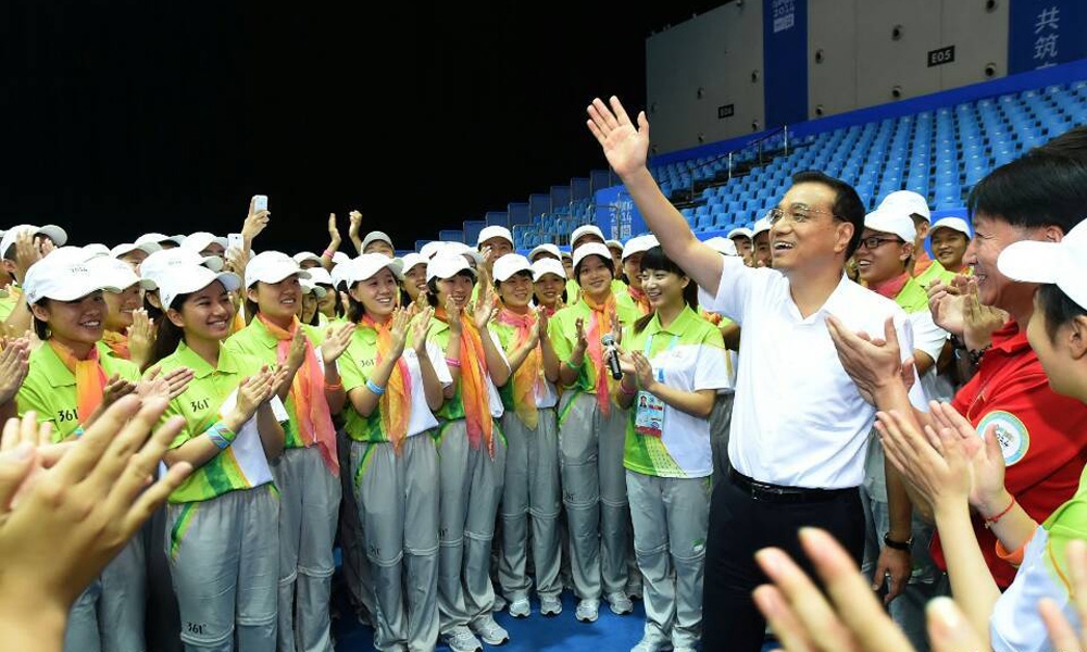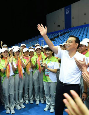 8月28日,李克强在南京出席第二届夏季青年奥林匹克运动会闭幕式之际,代表党中央、国务院专程看望青奥会志愿者代表,向2万多名中外志愿者表示亲切慰问。