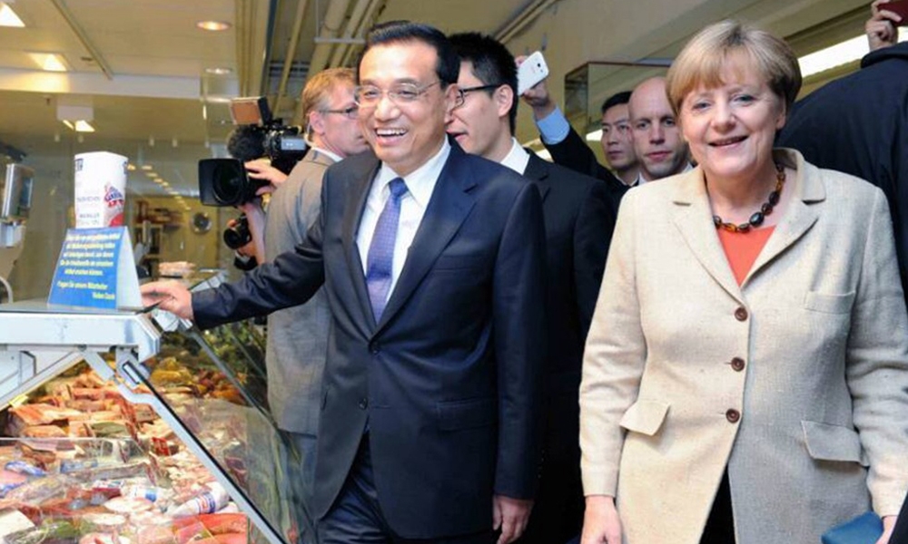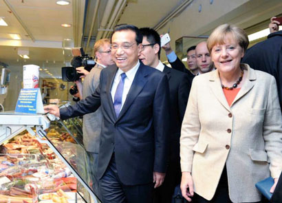 10月10日下午,中德总理结束政府磋商后,李克强、默克尔临时光顾了柏林一家超市。