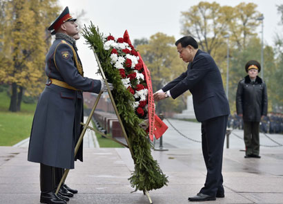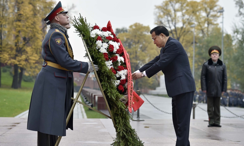 10月13日,李克强向俄罗斯无名烈士墓献花圈,这是俄方为李克强访问专门安排的首场正式活动。