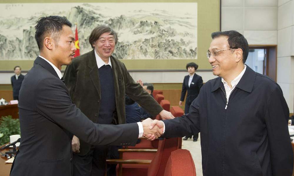1月17日,国务院总理李克强在北京中南海主持召开座谈会,听取教育、科技、文化、卫生、体育界人士和基层群众代表对《政府工作报告(征求意见稿)》的意见和建议。这是李克强同羽毛球运动员林丹握手。