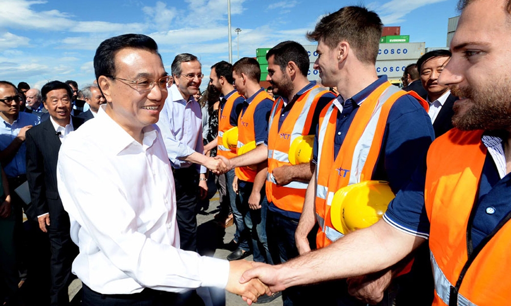 6月20日,国务院总理李克强与希腊总理萨马拉斯共同考察中国远洋运输集团比雷埃夫斯集装箱码头。这是李克强和萨马拉斯来到3号码头,同码头工人亲切交流。