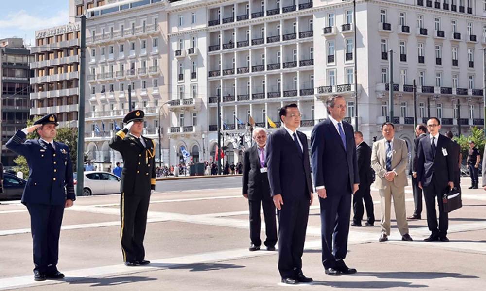 6月19日,中国国务院总理李克强在希腊总理萨马拉斯的陪同下,向希腊无名战士纪念碑献花圈。