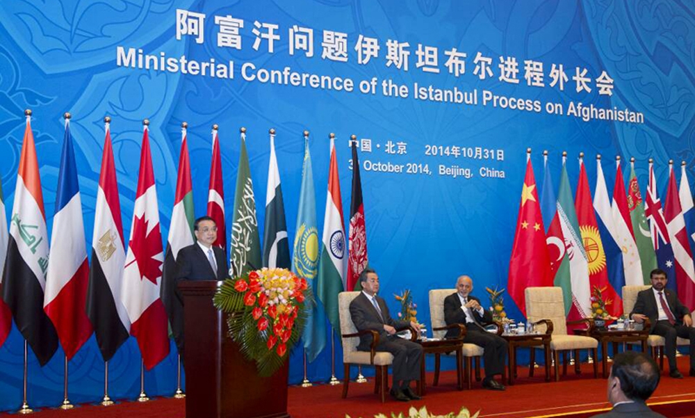 10月31日,中国国务院总理李克强在北京钓鱼台芳华苑与阿富汗总统加尼共同出席阿富汗问题伊斯坦布尔进程第四次外长会开幕式并致辞。