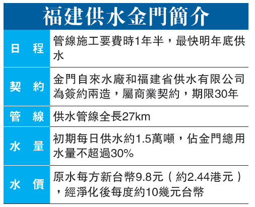 由于金门向大陆购水案属一般商业行为,这次金门县自来水厂与福建省供水公司签订购水契约,契约签订期限为30年,总经费新台币13.5亿元。自大陆引水的离岸原水价是每方水9.86元新台币(约2.44港元)。