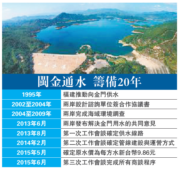金门地区长期缺乏淡水资源,早在1995年,金门县有关方面就提出自福建引水的请求,从1995年至2013年的18年间,福建有关部门积极与金门方面沟通交流,开展两岸通水技术研讨、项目前期和协商磋商工作,形成“引晋入金”供水线路方案,福建省供水有限公司、金门县自来水厂分别委托部分前期工作,双方完成海域环境调查、海底地质勘探、测量及成果对接,并探讨起草了供用水框架协议与商业供用水合同草案。