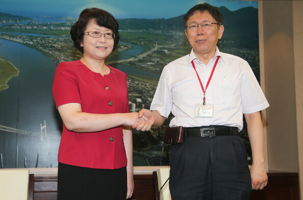 图:上海市副市长翁铁慧(左)上周前往台北市政府拜会台北市长柯文哲(右)\资料图片
