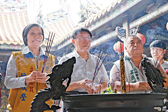 图:台北市长柯文哲(中)16日走访新竹县北埔商圈,到北埔慈天宫上香参拜/中央社