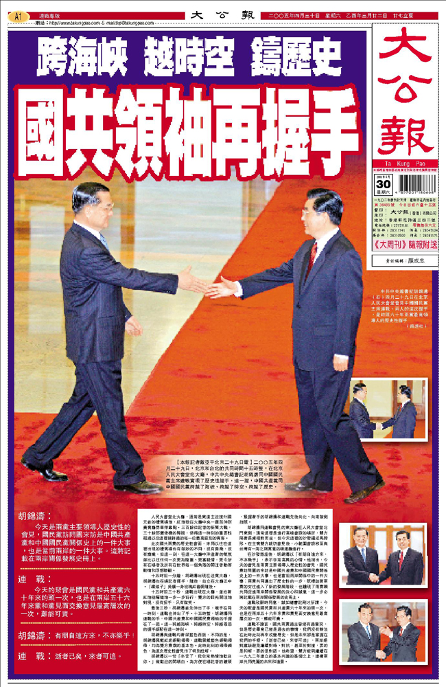 图:二○○五年四月三十日,大公报头版报道中国共产党总书记胡锦涛与中国国民党主席连战跨越六十年的握手