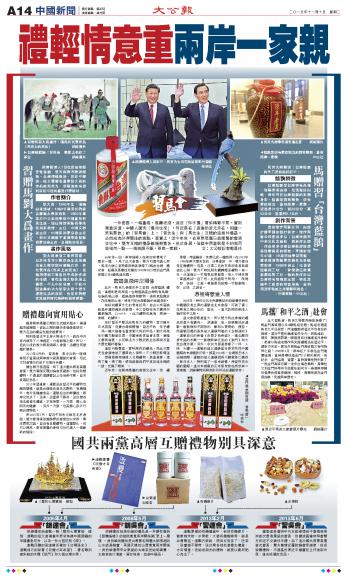 一件瓷器、一幅画卷、几坛老酒,这些“伴手礼”看似稀松平常,实则寓意深远。中国人讲究“礼尚往来”,何况是在“渡尽劫波兄弟在,相逢一笑泯恩仇”的“习马会”上,“习先生”与“马先生”互赠的这几件礼品,必然成为外界关注的焦点。事实上,近十年来,在两岸高层日益频繁的会面交往中,双方互赠的礼品虽种类繁多、形式各异,但个中用意却是不约而同地指向一点──海峡隔不断,两岸一家亲。