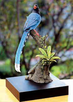 台湾蓝鹊是台湾特有品种,俗称长尾山娘,在低海拔山地,时常可见台湾蓝鹊的美丽身影。蓝鹊是群聚动物,很有家庭观念,象征两岸一家亲。瓷器长31公分、宽28公分、高53公分,重量约2.7公斤。
