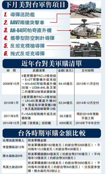 大公网11月27日讯 台媒引述彭博新闻报道,美国奥巴马政府将于下月中旬宣布总额约10亿美元(逾77亿港元)的对台军售案,军售项目可能包括导弹巡防舰、AAV7两栖突击车、AH-64阿帕奇直升机,以及携带型防空刺针导弹、反坦克标枪导弹与拖式反坦克导弹。中国国防部新闻发言人吴谦26日表示,坚决反对任何国家向台湾出售武器。