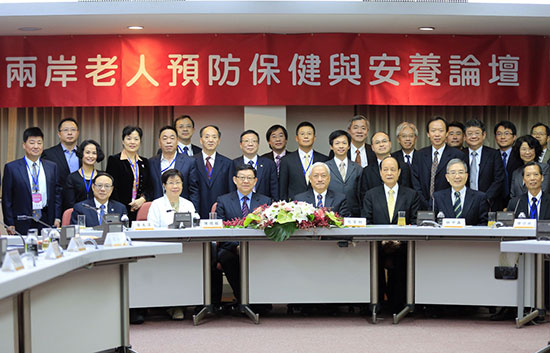 图:“两岸老人预防保健与安养论坛”1日在台湾桃园长庚大学举行。图为大陆海协会会长陈德铭与嘉宾合影\中新社