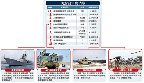 此次军(商)售内容有9项军售包括2艘“佩里级巡防舰”、13门全新以及将8门升级的“方阵快炮”与“先进战术数据链路系统”、36辆“AAV7两栖突击车”、250枚“人携刺针导弹”、769枚“拖式2B型导弹”、208枚“标枪导弹”、10套“迅安系统后续支援”、“AIM-9X遥测弹”,以及1项商售“猎雷舰战斗系统”。有台媒指出,台湾希望争取的潜舰、战机、空对地精准弹药都落空,多半是既有武器的数量补充或新款引进,但数量普遍不少。