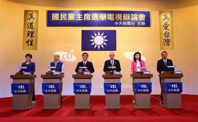 中国国民党党主席选举电视辩论会10日举行,6位候选人(从左到右) 洪秀柱、韩国瑜、郝龙斌、吴敦义、潘维刚、詹启贤分别就两岸关系阐述观点。 图片来源:台湾《中时电子报》