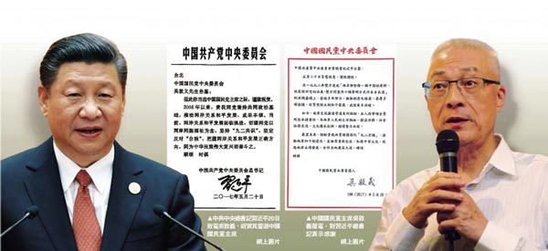 图左:中共中央总书记习近平20日致电吴敦义,祝贺其当选中国国民党主席;图右:中国国民党主席吴敦义覆电,对习近平总书记表示感谢。网络图片