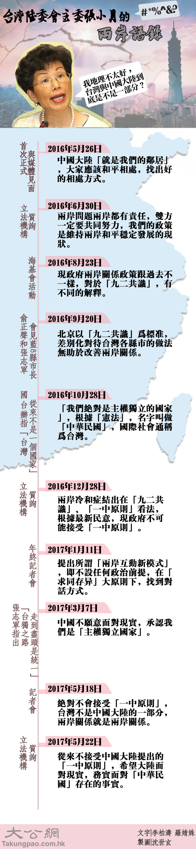 这一切,张小月可谓“功不可没”。她甫上任正式亮相,就提出“中国大陆是台湾的邻居”,要和平相处。此表述乍看无妨,但细究就会发现背后隐含的意会。从地理上看,日本、菲律宾、越南等国,都是台湾岛的“邻居”;张小月所言之“邻居”,暗含“邻邦”之意,将两岸暗喻为邻近的“国与国”,这与“独派”大佬辜宽敏的所谓两岸“兄弟之邦”,是否如出一辙?