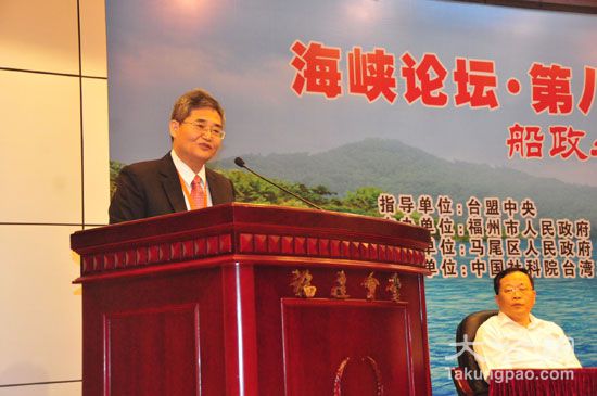 中国国民党发展研究院院长、台湾文化大学副教授林忠山在第八届海峡两岸船政文化研讨会上代表台湾学者致词时呼吁:台湾应尽快走上一带一路(史兵摄)