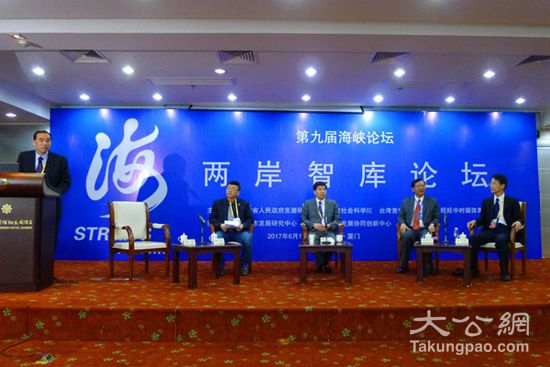 18日下午,第九届海峡论坛两岸智库,就“扩大民间交流 深化融合发展”主题深入探讨。左起福建省政府发展研究中心党组书记李强,台湾经济研究院董事邱毅、国务院发展研究中心副主任张军扩、台湾经济研究院院长林建甫、台湾中国文化大学社科院院长赵建民。/蒋煌基摄