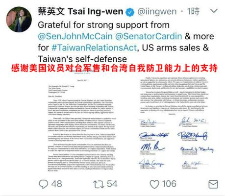 海外网6月26日电 美国两党8位联邦参议员23日联名致函给美国总统特朗普,称“行政部门要定期且一贯地支持台湾的自卫能力”,还要求特朗普政府“立刻送交”军售台湾的通知书给国会。蔡英文也急忙“抱大腿”,今天(26日)在推特附上美议员的联名信函并发文,称“感谢美国议员对台军售和台湾自我防卫能力上的支持”。
