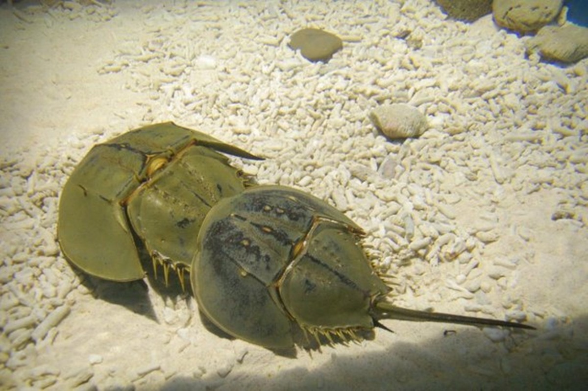 在交尾繁殖季节,发育成熟的中国鲎总是成双结对出现。(受访者供图)