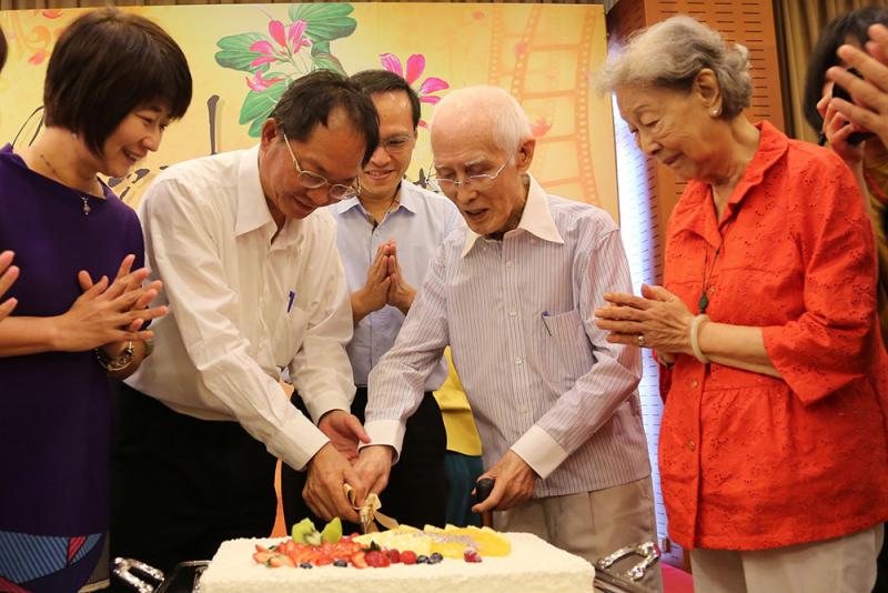 资料图:台湾中山大学10月26日为余光中(右二)预祝九十大寿,由妻子范我存(右一)陪同出席 中央社