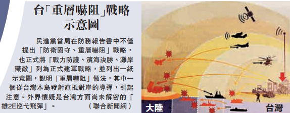 报告书提到,台军以创新“不对称”的思维建构联合战力,使敌人陷入多重困境,吓阻敌人不可轻启战端,但如果敌人执意进犯,台军会以“战力防护、滨海决胜、滩岸歼敌”的用兵理念,实施重层拦截和火力打击,阻敌人登岛进犯。