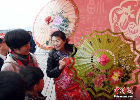 来自台湾高雄市油纸伞制作艺人向市民展示她的油纸伞作品。 刘可耕 摄