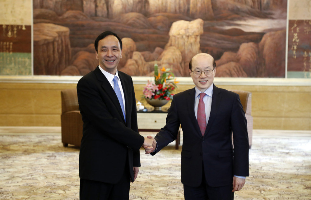图:中共中央台湾工作办公室、国务院台湾事务办公室主任刘结一(右)二十六日在上海会见了台湾新北市市长朱立伦一行\中新社