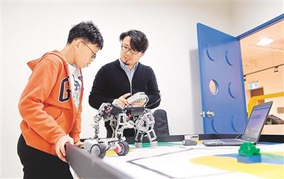 台湾青年徐国峰(右)教学生设计机器人运动程序。(图源:新华社)