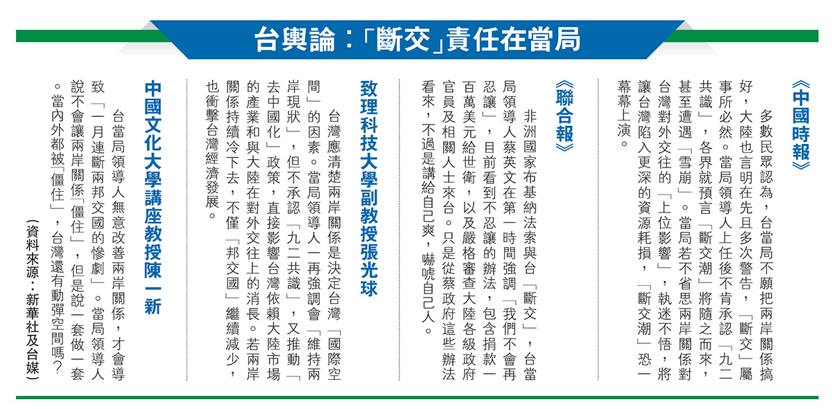 【大公报讯】在宣布与台湾“断交”后的第3天,非洲国家布基纳法索与中国大陆恢復了大使级外交关系。接连袭来的“断交冲击”让台湾的“外交前景”更加暗淡,岛内舆论一边担忧和抱怨,一边开始各种猜测:谁会是下一个和台湾“断交”的“友邦”?是不是那唯一的非洲“邦交国”伊斯瓦蒂尼(斯威士兰)?中国国务委员兼外交部长王毅日前表示,“长期以来,中非双方都期盼着早日实现‘大团圆’,照一张‘全家福’。今天,我们朝着这个目标又迈近了一步。”有分析指出,如果伊斯瓦蒂尼也弃台而去,那台湾在非洲就是“零邦交”了。