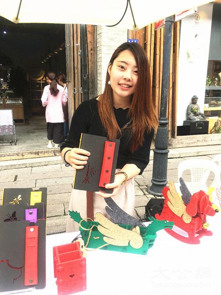 台湾实践大学国贸系大四学生思洁在介绍她在上海麦可文创园实习单位的文创产品。(何德花摄)
