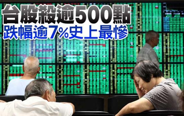 政府注资、约谈券商、禁止做空、调查外资……海峡对岸也开始启动一系列救市动作。台湾股市今天上演空前崩盘走势,盘中指数一度大跌583.85点,跌幅逼近7.5%,创下台股有史以来跌幅最大记录。“总统府”发言人陈以信表示,马英九要求“行政院”对此次全球性股灾立即全面动员备战。台湾“行政院长”毛治国紧急召集各部门负责人开会,台“副财长”吴当杰透露,会议做出两项救市决议,包括启动“国安基金”机制,以及四大基金持续加码进场护盘。
