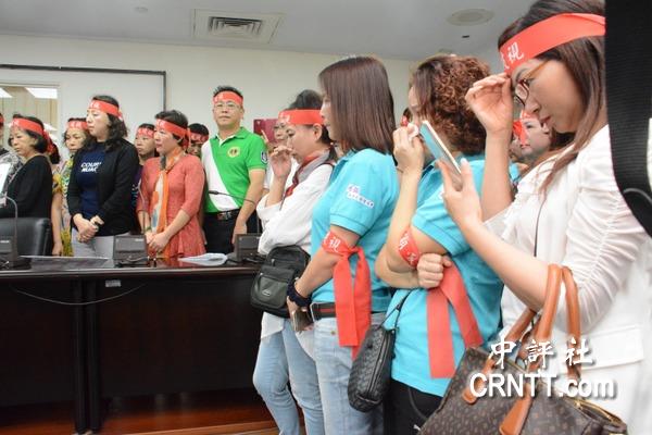 在场陆配绑抗议布条,对意外学生家长的说明,闻之落泪。/中评社