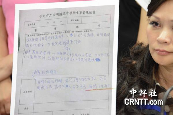 记者会出示女学生与老师生冲突后事件说明书,内容已有轻生念头。/中评社