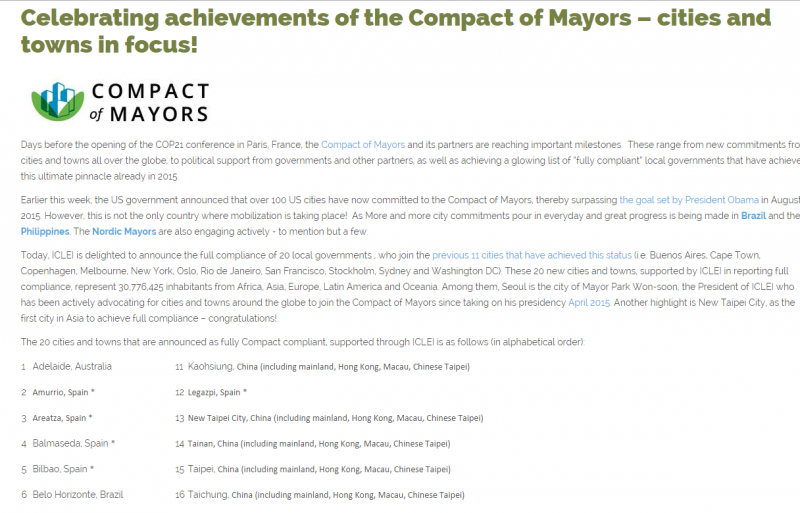 联合国城市气候高峰会于2014年9月成立“全球市长联盟”(Compact of Mayors),致力于敦促各大城市节能减碳,以对抗气候变迁的挑战。“市长联盟”于26日公布全球20个节能减碳达标的城市,其中台湾共有5个城市达标,分别为高雄、新北、台南、台北及台中,这份名单挂名的后面都加注了中国(China),对此,这五个城市均表示抗议,高雄市长陈菊更是宣称,如果不做更改,“高雄市将宣布退出市长联盟”。