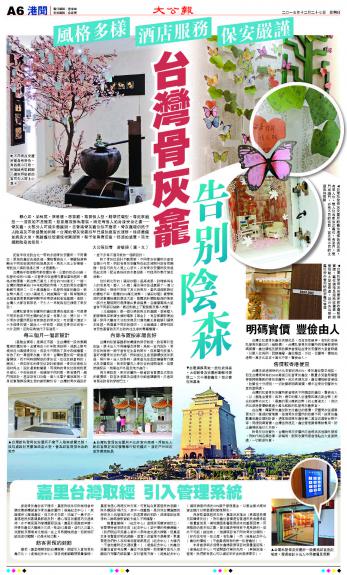 大公网12月27日讯(记者曾敏捷)静心居、品秋苑、怀恩楼、思云厅、尊爵个人型、精华伉俪型、尊钰家庭型……这说的不是屋苑、饮宴厅或家俬套装,而是每个人的身后安身之处─骨灰龛。大部分人可能未意识到,在香港骨灰龛位供不应求、骨灰龛场仍然予人阴森及不安感觉的同时,台湾的骨灰安置所早已提供酒店式服务,接待处俨如酒店大堂,无论龛位设置或相关服务,都予使用者庄重、舒适的感觉,完全摆脱阴森的气氛。