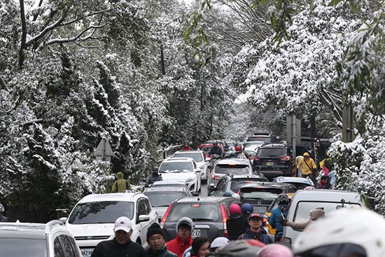 图:岛内虽有多人冻死,但24日台北仍有大批民众不畏严寒,涌进阳明山赏雪/中央社