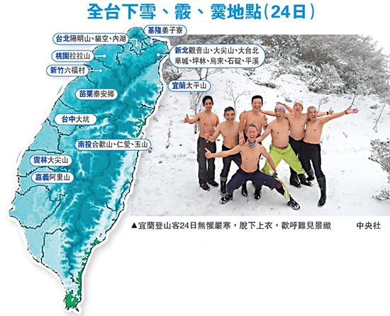 另外,位在新北市乌来山区的信贤部落和坪林区即坪林与宜兰交界的石牌与南山寺附近,24日晚也飘雪,就连在南台湾屏东县大武山上也降冰霰。